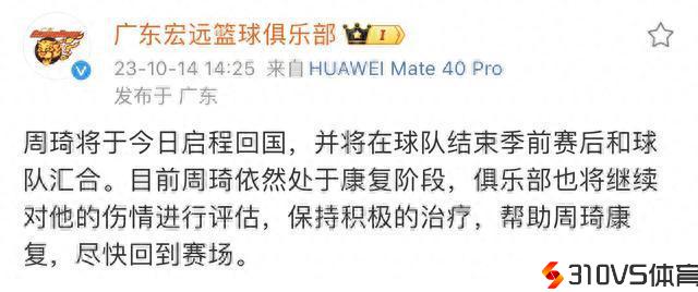 广东宏远篮球俱乐部:周琦将于14日启程回国,目前处于康复阶段