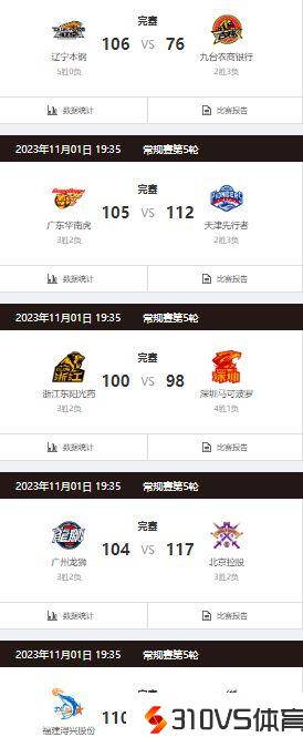 辽宁106-76吉林;广东105-112天津;广厦100-98深圳;广州104-117北控;福建110-89江苏;