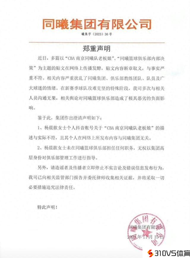 大约意思就是陈曦的老婆杨晨歆女士团体抖音账号关于“CBA南京同曦队老板娘”的描画与实践不符,曾经引发集团高层的不满,再次声明杨晨歆女士并不是俱乐部的高层,任何行为和同曦集团有关。