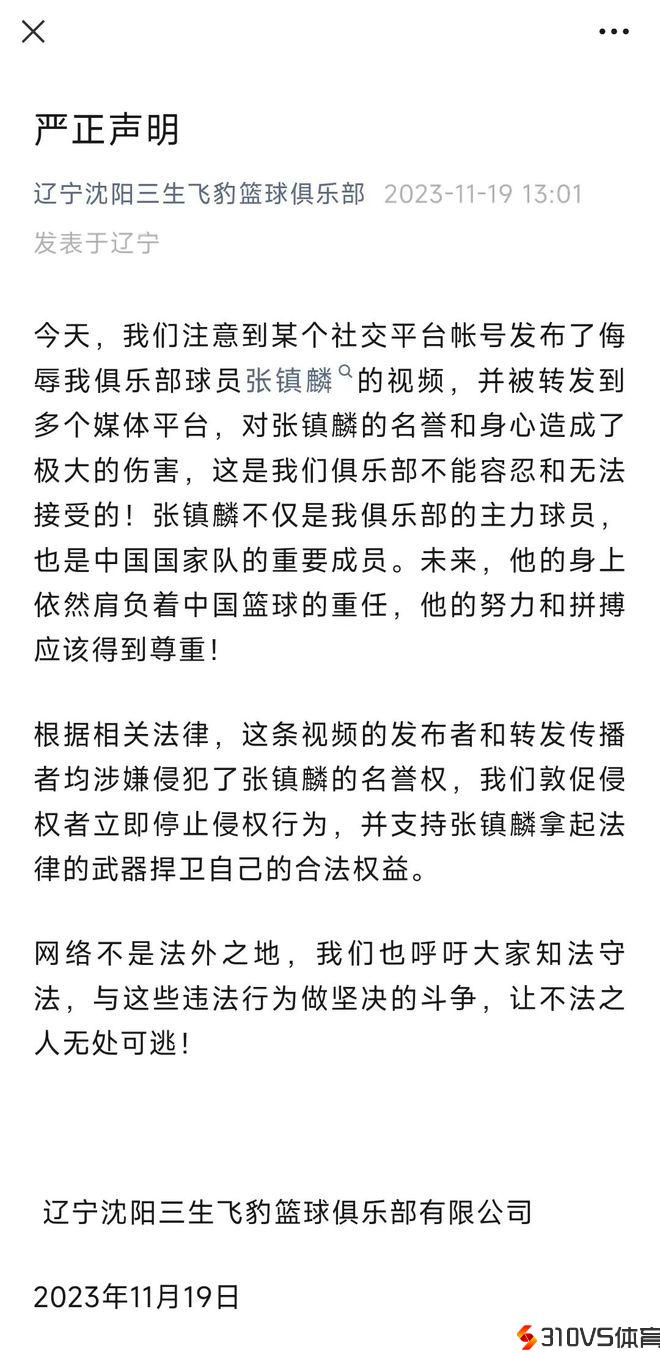 近日,有用户在互联网平台中发布欺侮辽宁男篮球员张镇麟的视频,并被转发到多个媒体平台。随后,辽宁男篮官方发布声明,呼吁外界知法违法,敦促侵权者立刻中止侵权行为。