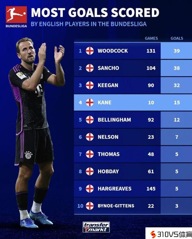 单赛季能破纪录吗?英格兰球员德甲进球榜单:凯恩10场15球第四