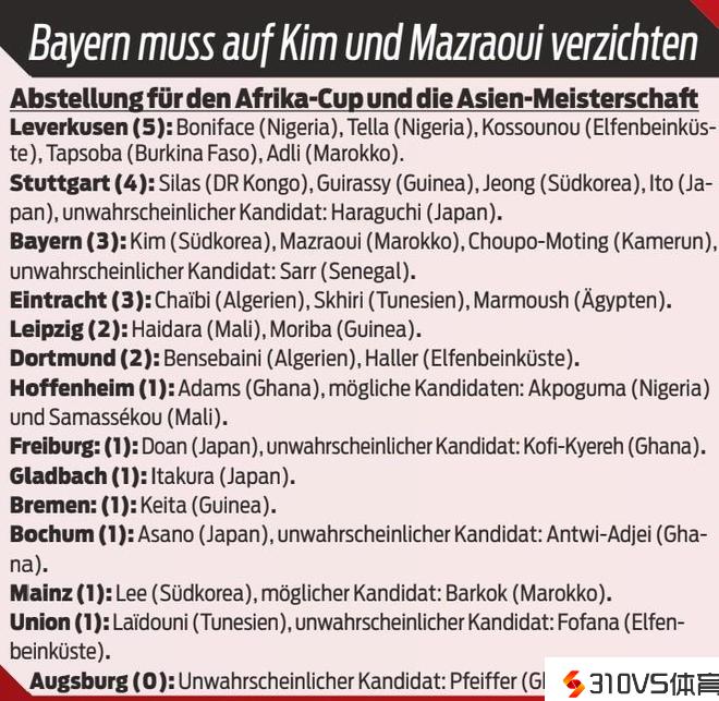 德甲各队参与亚洲杯、非洲杯球员:药厂5人最多,拜仁3人