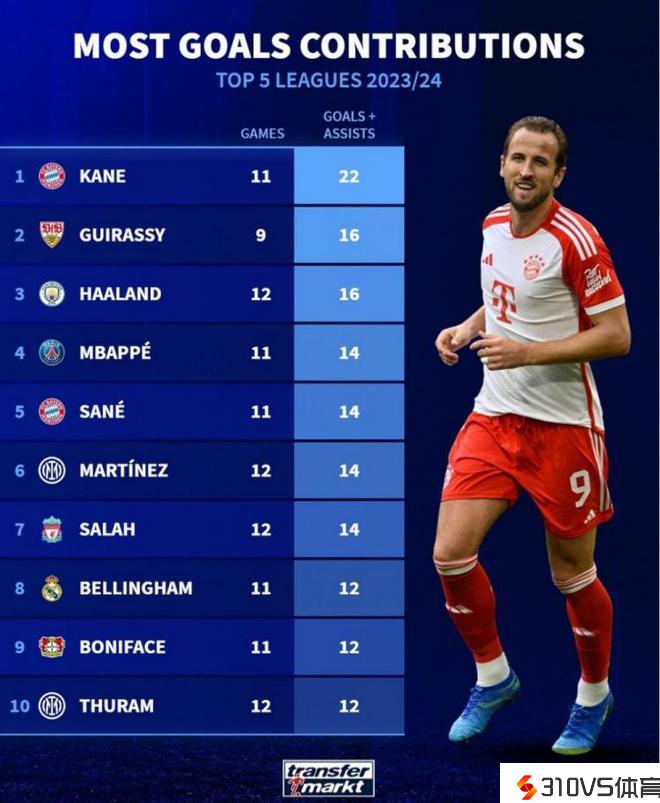 五大联赛参与进球排名:凯恩造22球居首,前10名4人来自德甲