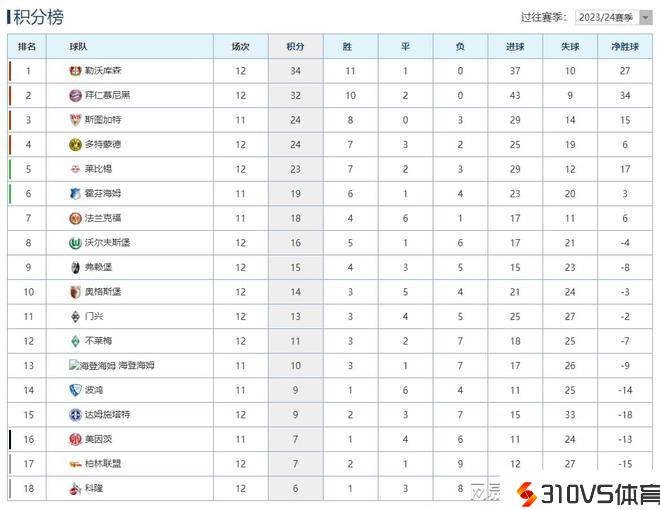 德甲最新积分榜:勒沃库森8连胜2分领跑,多特4球逆转攀升第4!