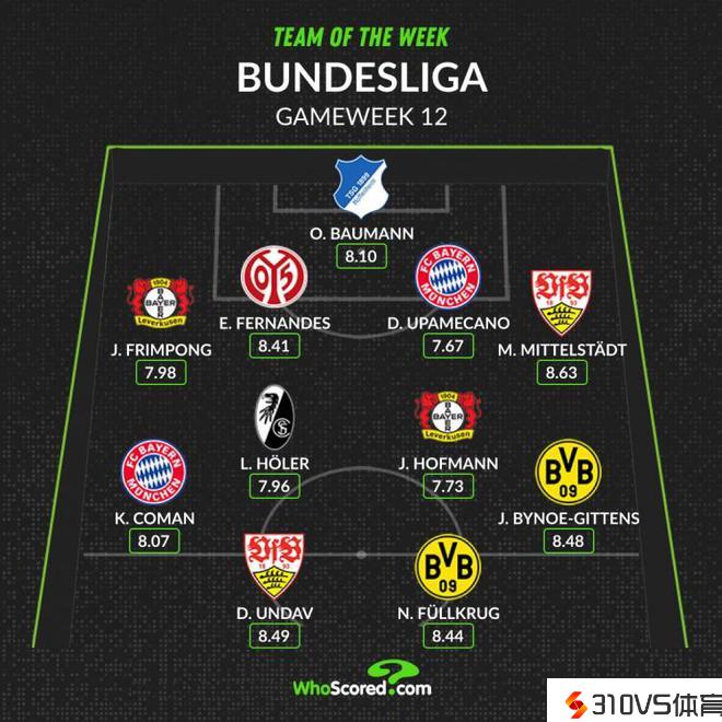 WhoScored德甲第12轮最佳阵:科曼、于帕、菲尔克鲁格在列