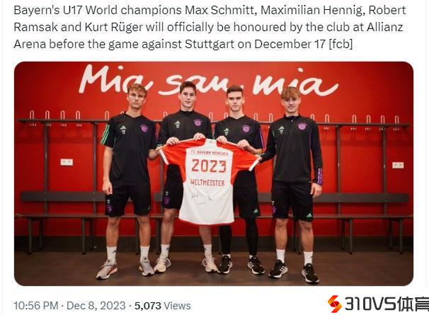 官方:4位拜仁U17世界杯冠军球员将在下周德甲赛前接受俱乐部惩处