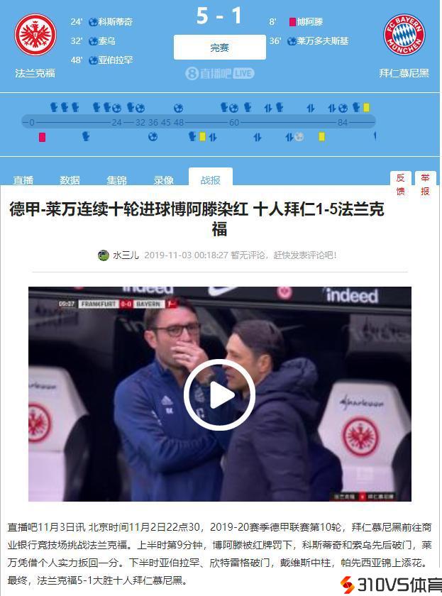拜仁1-5落后法兰克福!4年前科瓦奇因相正比分输法兰克福下课!