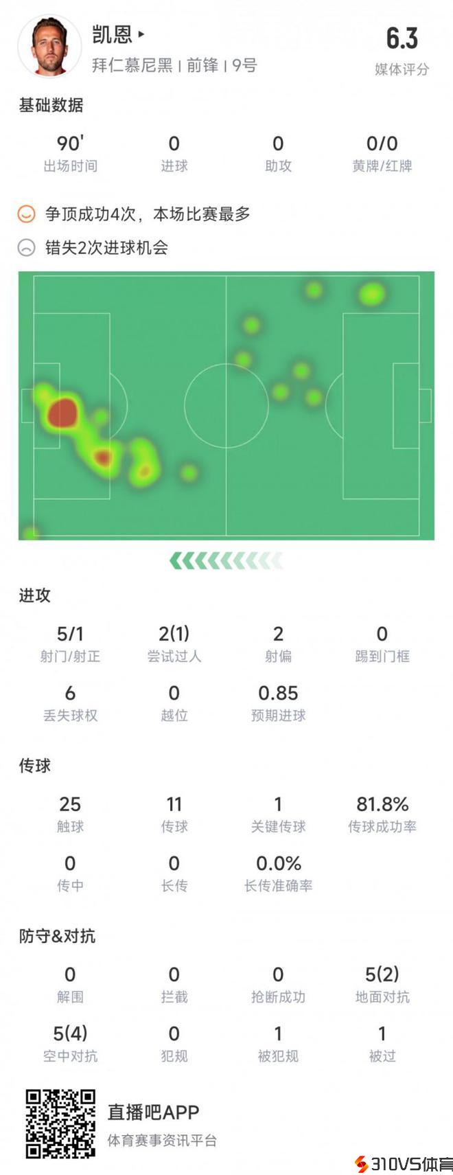凯恩本场数据:2次错失良机,5次射门1射正,1次关键传球