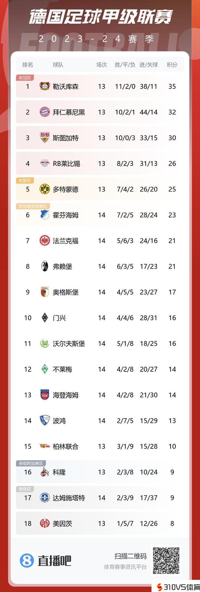 德甲积分榜:拜仁落后药厂3分居第二,法兰克福位列第七
