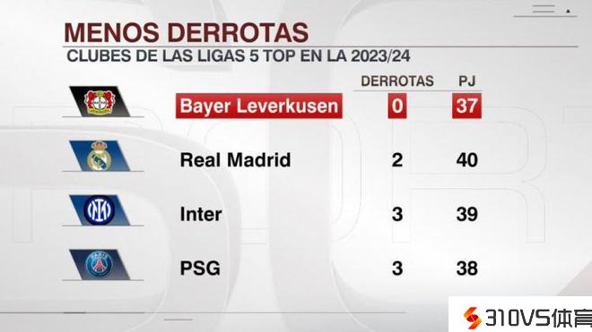 本赛季五大联赛球队失利最少榜:药厂不败居首,皇马2场次席