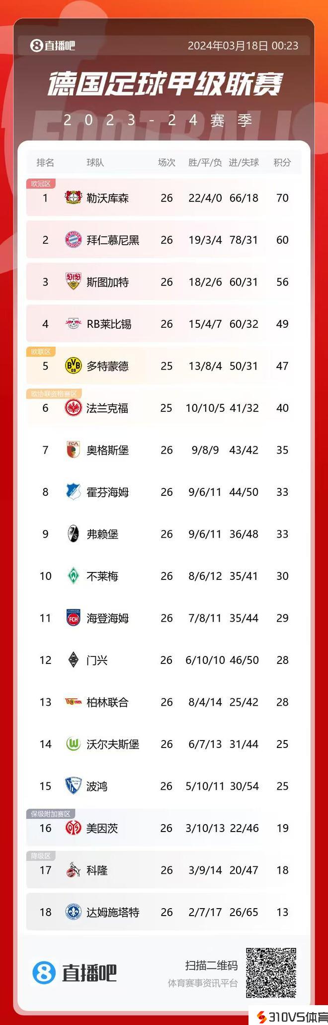 德甲积分榜:勒沃库森26轮不败,剩8轮抢先第二拜仁10分