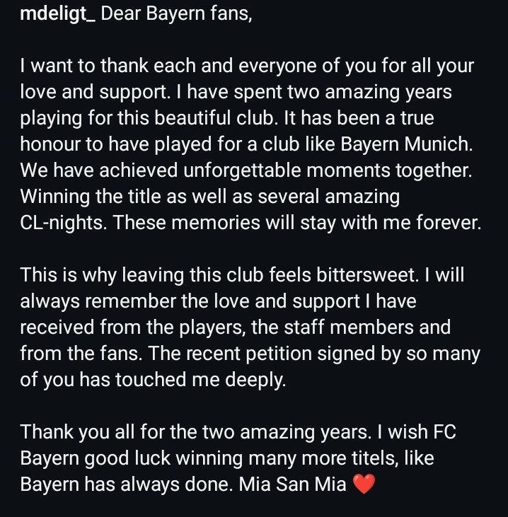 德里赫特写道:“亲爱的拜仁球迷,我想要谢谢你们每一个人对我的爱与支持。我在这家美丽的俱乐部度过了非凡的两年,能为拜仁慕尼黑这样的俱乐部效力是真正的荣幸。我们曾一同取得了许多难忘的成就,赢得德甲冠军,还有许多个美妙般的欧冠之夜,这些回忆会永远伴随着我。”