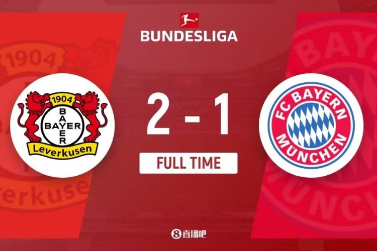 下半场伤停补时5分钟,全场比赛结束,最终拜仁1-2勒沃库森。