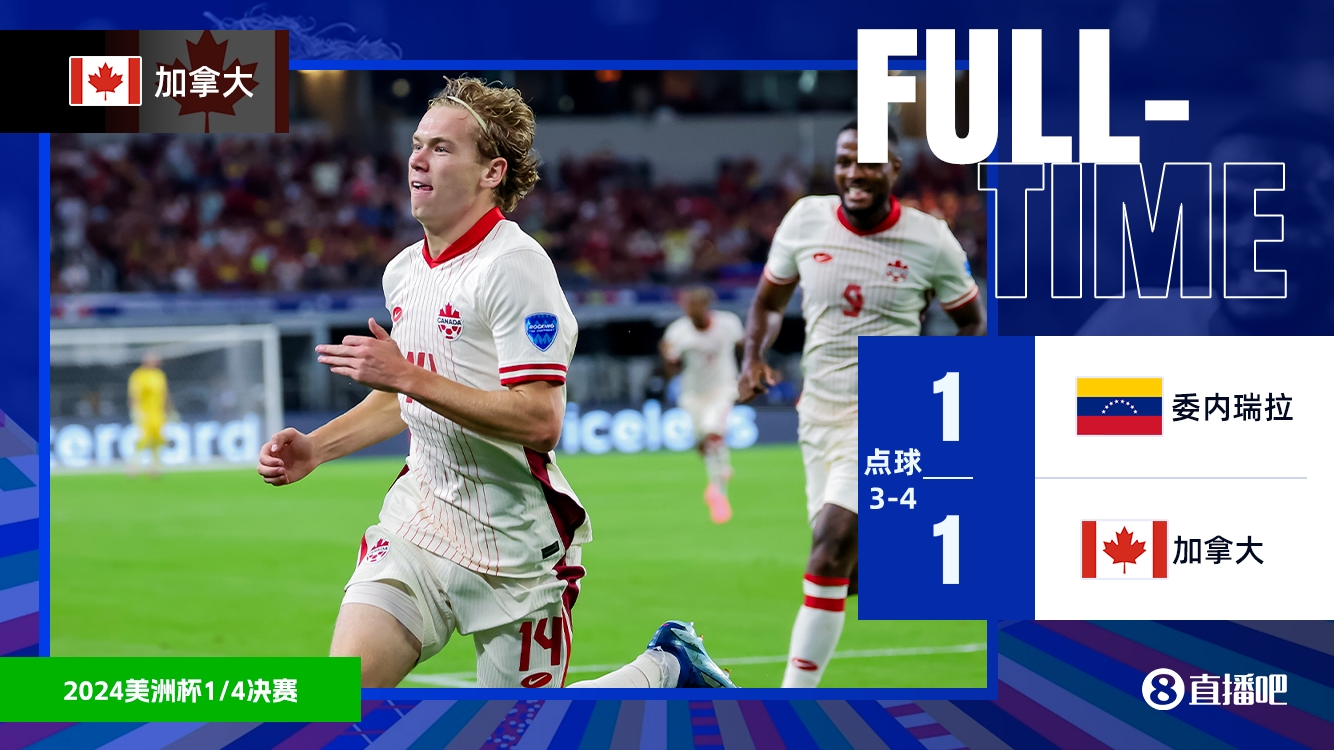 7月6日讯 北京时间7月6日早晨9时,美洲杯四分之一决赛,委内瑞拉对阵加拿大。上半场,沙菲尔博格首开纪录,随后乔纳森-戴维错失一次单刀良机。委内瑞拉半场0-1落后加拿大。下半场,龙东超远距离吊射扳平。两队90分钟战成1-1,直接进入点球大战。加拿大点球大战4-3委内瑞拉,最终加拿大总比分5-4淘汰委内瑞拉,晋级半决赛,将对阵阿根廷。