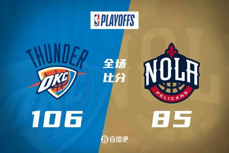 比赛开始,双方开场势均力敌,比分交替领先,雷霆内外开花占据主动,次节前半段双方依旧缠斗,此后雷霆突然发力,三分4连击将分差拉开到两位数,半场战罢雷霆60-46领先14分。易边再战,雷霆牢牢占据场上主动,又是三分3连击扩大优势,鹈鹕强攻内线拿分苦苦支撑,末节雷霆持续发力打出10-2将分差拉开到20分以上,鹈鹕大势已去无力回天。最终,雷霆106-85再胜鹈鹕,总比分3-0领先拿到赛点。