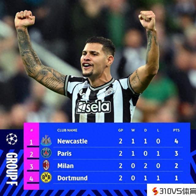 欧冠F组第2轮,纽卡主场4-1击败巴黎!纽卡官推晒出死亡之组积分榜,纽卡2轮4分,力压巴黎、米兰、多特登顶!