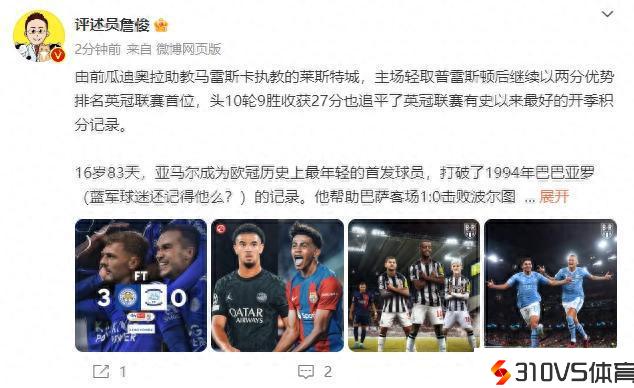詹俊:由前瓜迪奥拉助教马雷斯卡执教的莱斯特城,主场轻取普雷斯顿后继续以两分优势排名英冠联赛首位,头10轮9胜收获27分也追平了英冠联赛有史以来最好的开季积分记载。