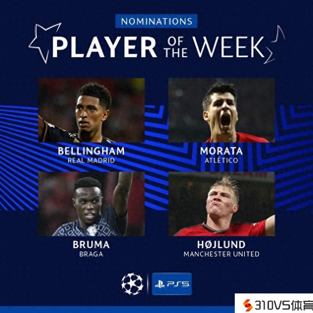 本轮欧冠官方最佳球员候选:贝林厄姆领衔,霍伊伦、莫拉塔在列
