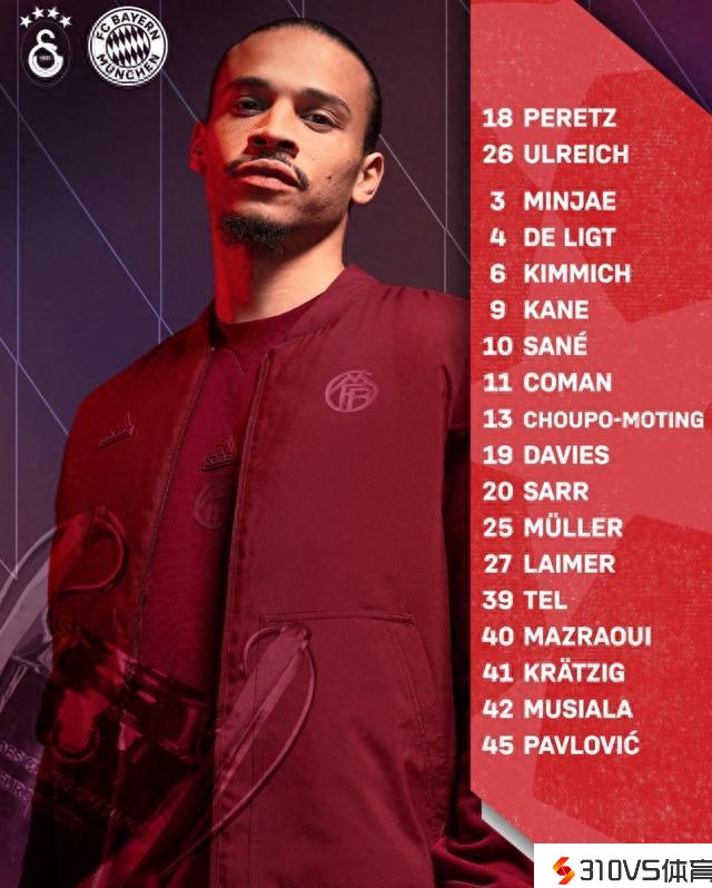拜仁欧冠对阵加拉塔萨雷大名单:凯恩领衔锋线,基米希坐镇中场