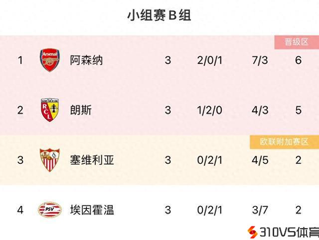 欧冠B组积分榜:阿森纳2胜1负6分登顶,塞维2平1负第三