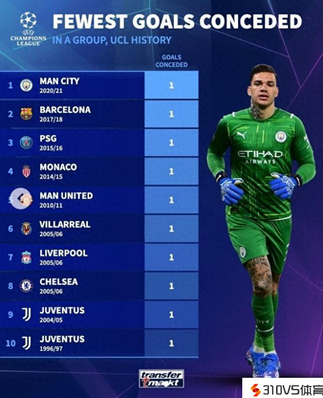 不曾有球队在欧冠小组阶段全部零封,曼城&巴萨等仅失一球最少