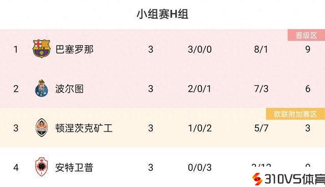 欧冠H组积分榜:巴萨3轮9分居首,波尔图6分第二,矿工3分第三