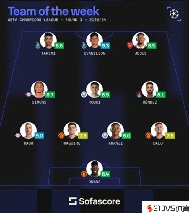 Sofascore评本轮欧冠最佳阵:热苏斯领衔,奥纳纳、马奎尔在列
