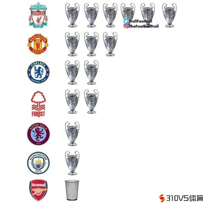 英超球队欧冠冠军排行榜:利物浦6冠高居榜首