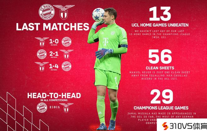 拜仁将在主场安联球场停止与拉齐奥的欧冠16强第二回合的竞赛,拜仁首回合0-1失利,他们需求逆转才干晋级欧冠四分之一决赛。拜仁官方罗列了双方本场竞赛的一些数据。