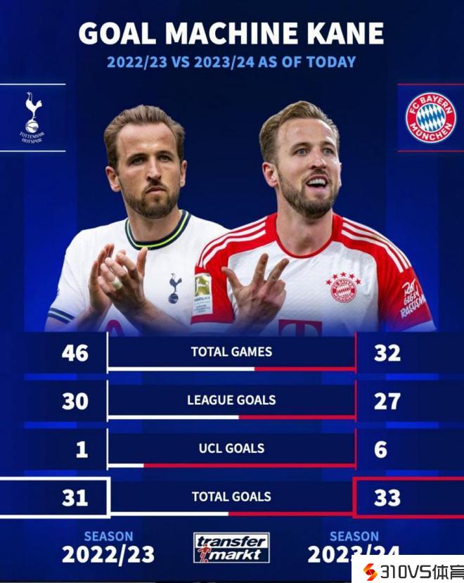凯恩近两个赛季数据对比:上赛季46场31球,本赛季32场33球
