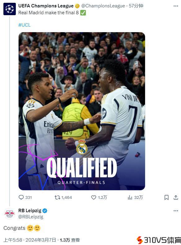 欧冠官推祝贺皇马晋级,莱比锡评论“祝贺”+“呵呵”emoji