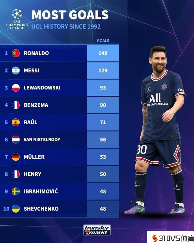 欧冠历史射手榜:C罗140球高居榜首,梅西129球第二,莱万93第三