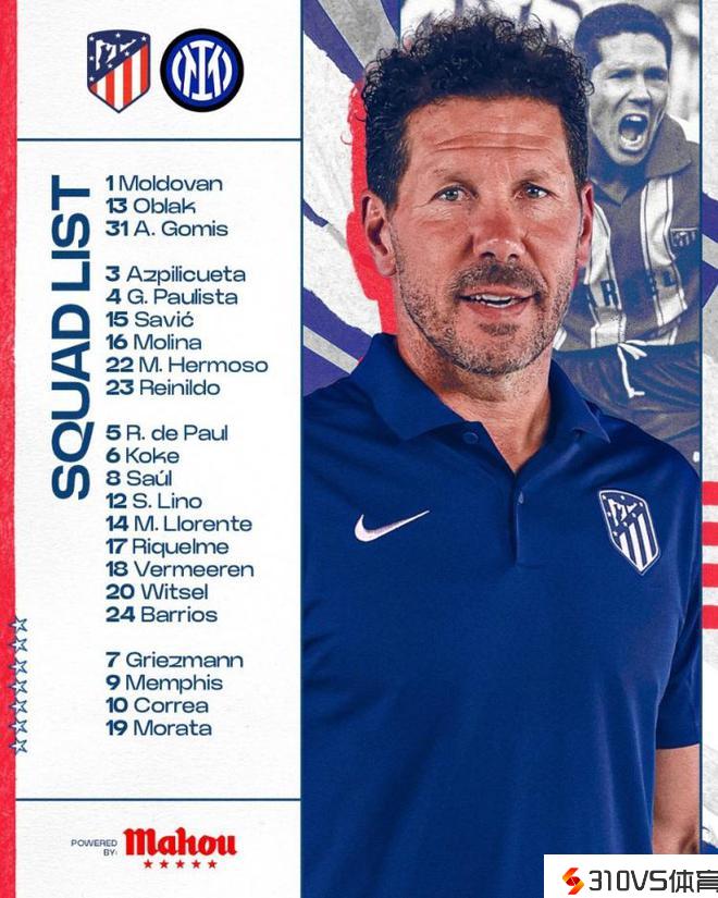 马竞发布欧冠战国米大名单:格列兹曼复出,莫拉塔&科克在列