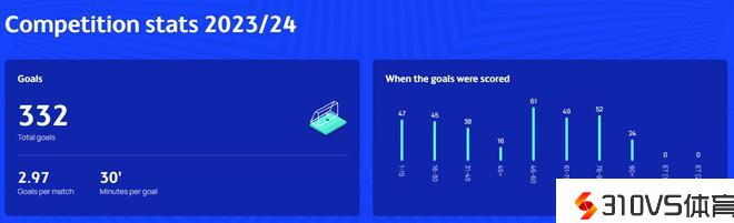 欧足联官方数据统计,本赛季欧冠到目前为止,总计出现332粒进球,平均每场竞赛发生2.97粒进球,平均每30分钟1球,加时赛阶段还没有进球出现。