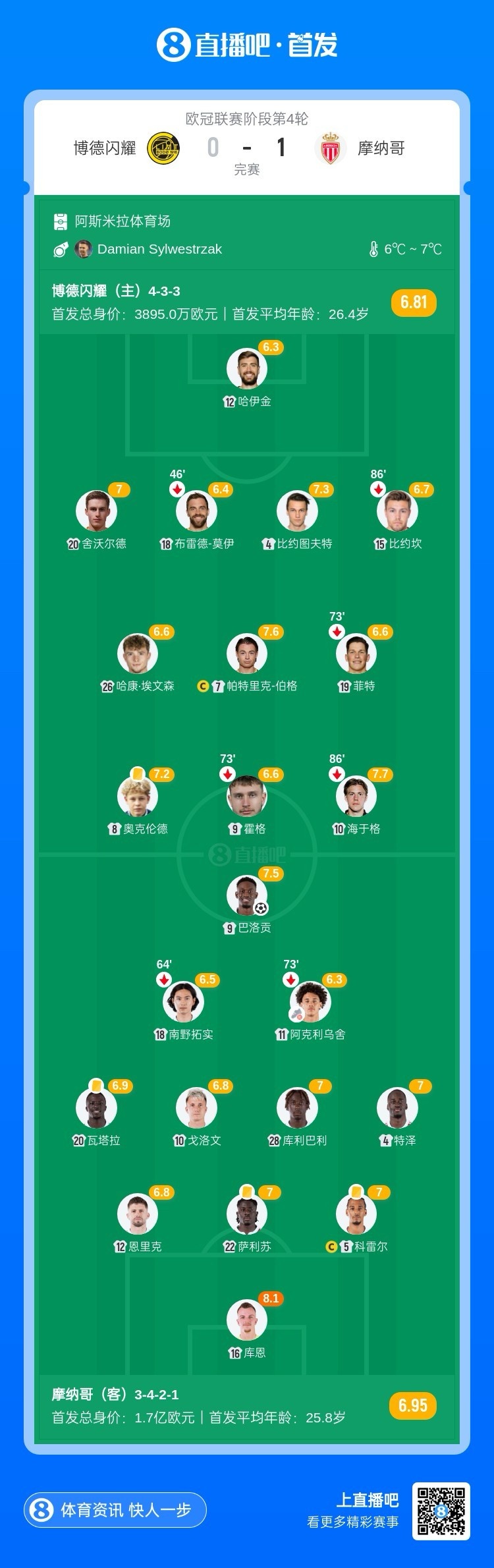 全场比赛结束,摩纳哥客场1-0战胜十人博德闪耀。