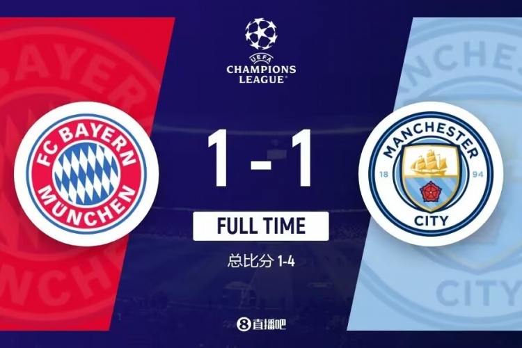 下半场伤停补时5分钟,全场比赛结束,最终拜仁1-1曼城。