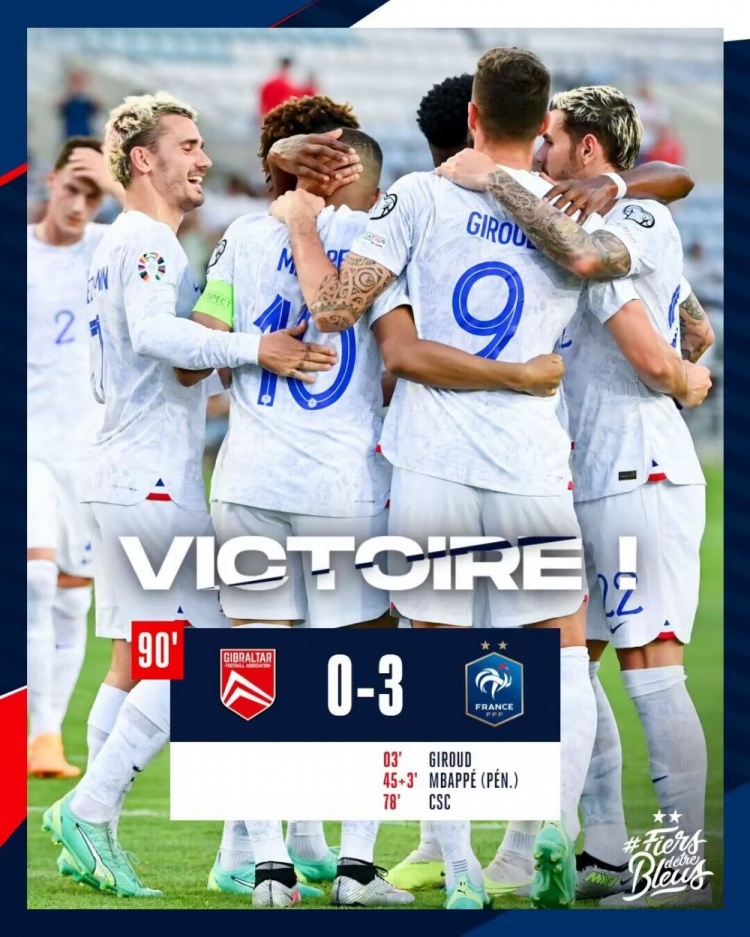 6月17日讯 北京时间6月17日凌晨2点45分,2024年欧洲杯预选赛B组第3轮展开角逐,法国客场挑战直布罗陀。上半场吉鲁先拔头筹,琼阿梅尼头球中框,姆巴佩点射扩大比分,下半场格列兹曼中柱,姆巴佩造乌龙,琼阿梅尼和迪萨西中框。最终法国客场3-0完胜直布罗陀,法国欧预赛开局取得三连胜。B组积分榜方面,法国积9分继续领跑,直布罗陀积0分垫底。