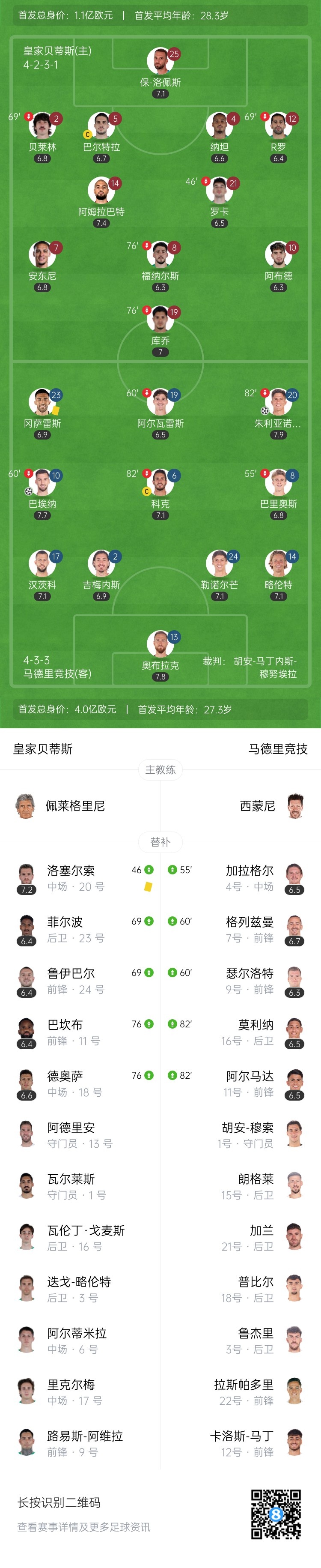 下半场补时4分钟。最终全场比赛结束,贝蒂斯0-2马竞。