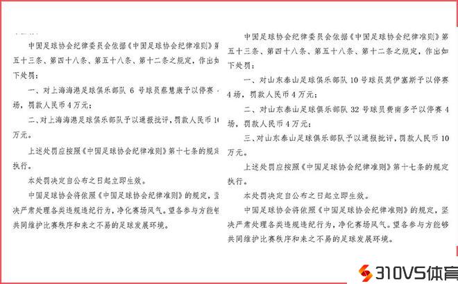 莫伊塞斯、费南多、蔡慧康,三人皆因暴力行为,均被罚4万,并且停赛4场。而上海海港俱乐部、山东泰山俱乐部,两大球队也被通报批判,同时各罚款10万!总共罚款32万,停赛12场!