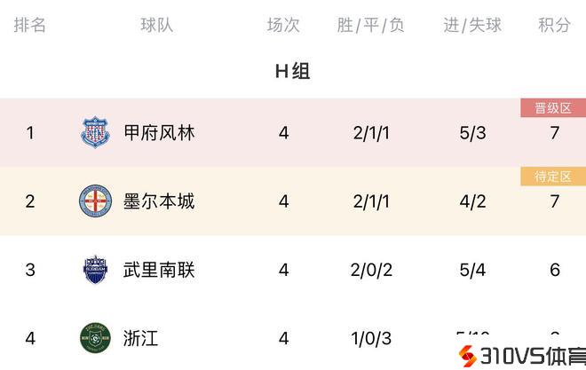 亚冠H组积分:J2第六甲府风林登顶,墨尔本武里南二三位,浙江垫底