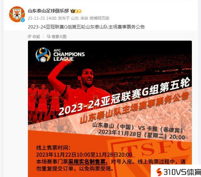 在足协杯之后,泰山队还将参与28日亚冠小组赛第5轮的竞赛,主场迎战卡雅FC队。在首轮竞赛中泰山队曾客场3比1打败对手,此役主场作战球队目的就是成功,以取得小组出线的自动权。距离这场竞赛还有一周的时间,泰山队在21日下午14点也官宣音讯,主场门票行将开售。