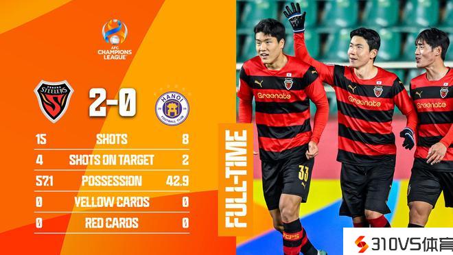 亚冠小组赛浦项制铁2-0击败河内FC,小组赛5连胜领跑