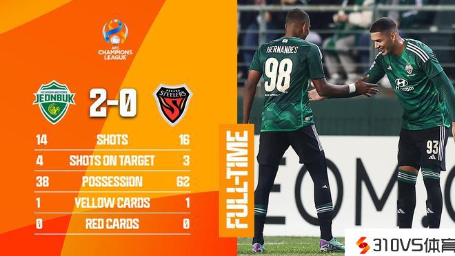 亚冠联赛1/8决赛首回合继续停止,在昔日停止的K联赛内战中,全北现代主场2-0击败浦项制铁,取得晋级先机。