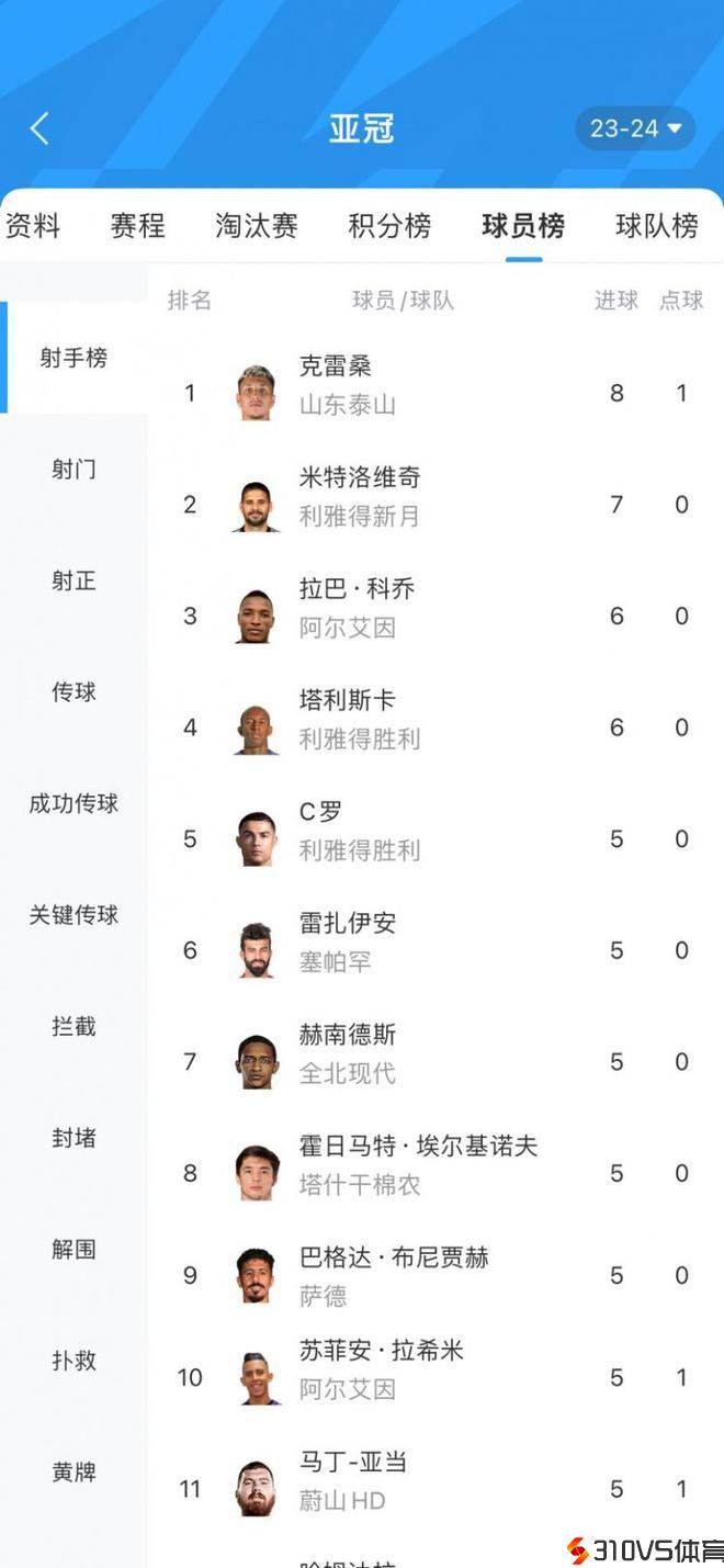 亚冠最新射手榜:克雷桑8球领跑,米神7球第二&C罗5球第五