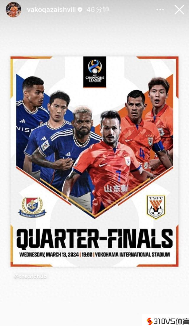 大战一触即发!泰山外援卡扎伊什维利晒亚冠客战横滨海报