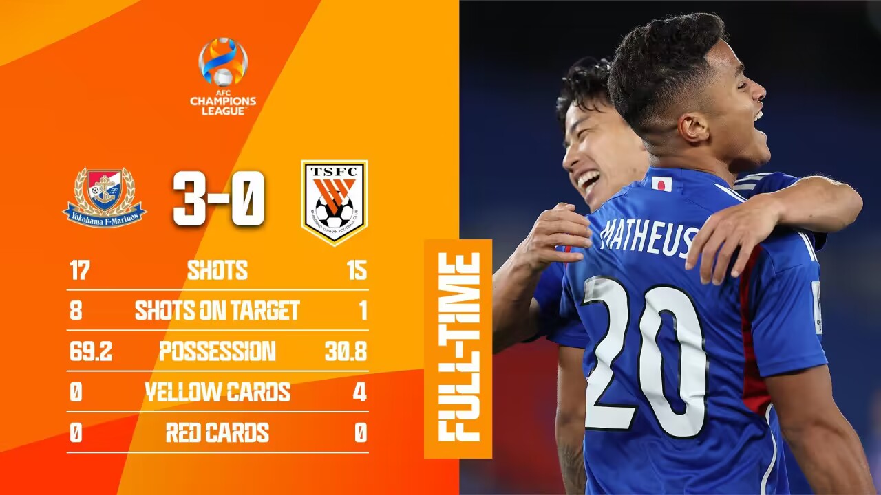 第64分钟,埃尔伯中线附近送出直传球,马特乌斯前插吊射破门,山东泰山0-3落后横滨水手。↓