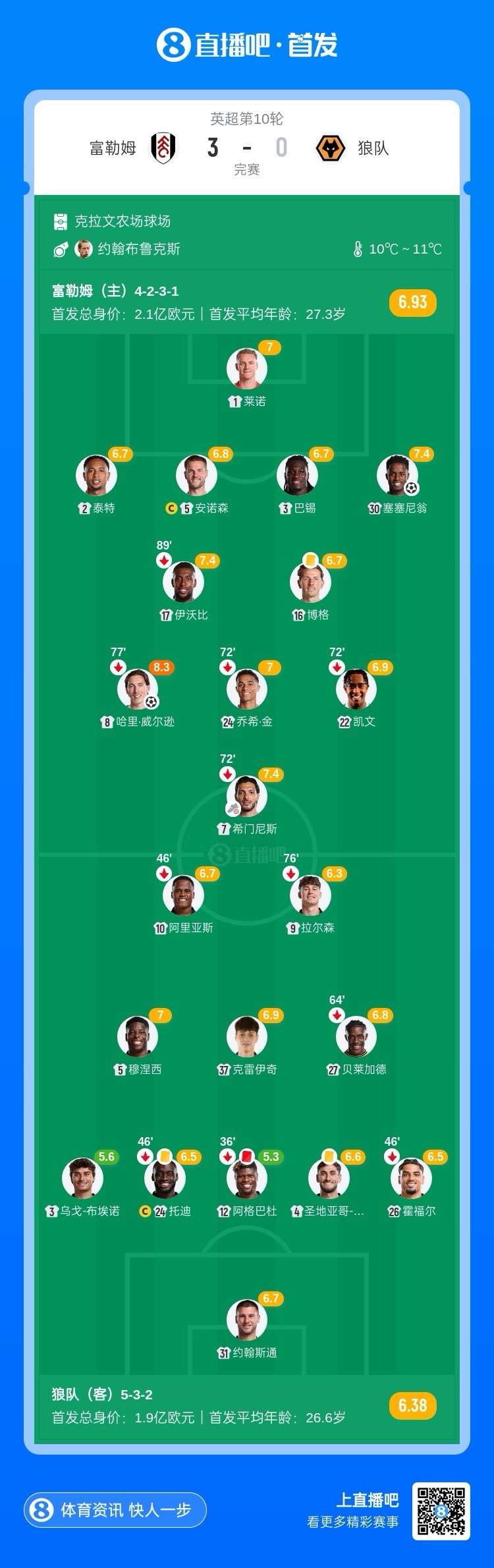 全场比赛结束,富勒姆主场3-0完胜十人狼队。