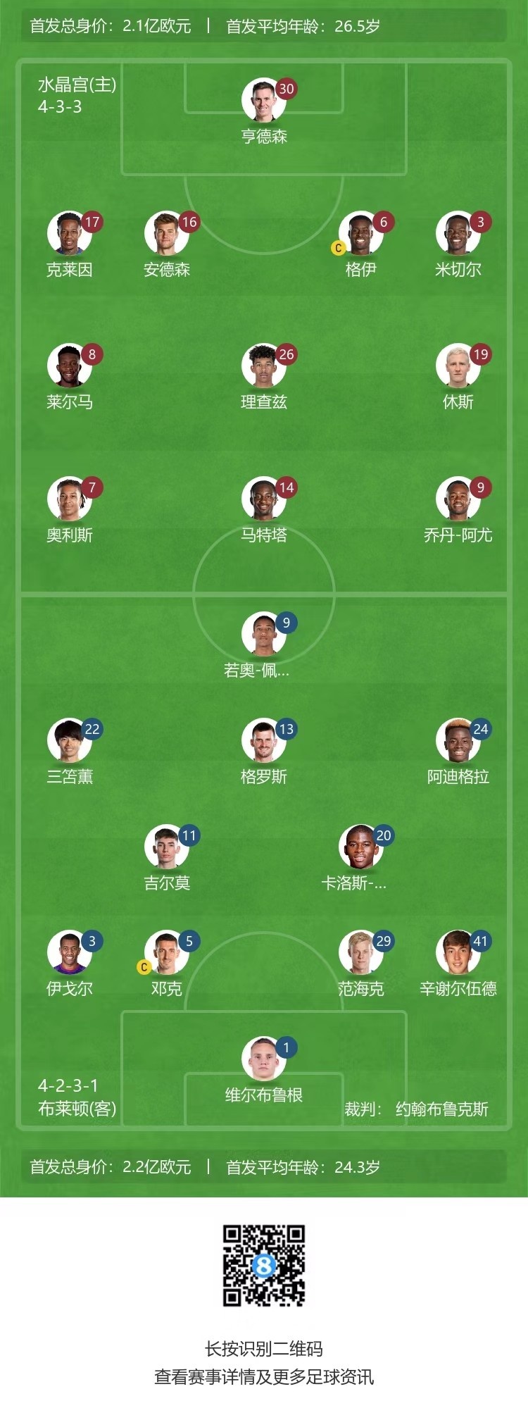 12月22日讯 北京时间4:00,英超第18轮布莱顿客场挑战水晶宫。上半场,奥利斯头球拦截+助攻阿尤破门;下半场,维尔贝克替补头球十分角救主。最终,布莱顿1-1战平水晶宫,先赛一场暂升第8,水晶宫仍居第15。