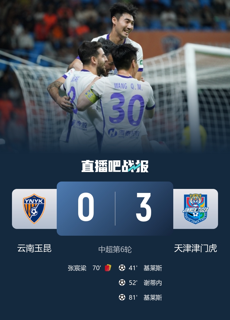 4月17日讯 北京时间4月17日20:00,2026赛季中超第6轮,云南玉昆在玉溪高原体育中心迎战天津津门虎。上半场,王政豪助攻基莱斯单刀破门;下半场,基莱斯传中助攻谢蒂内破门,张宸梁吃到两张黄牌被罚出场。最终天津津门虎在客场以3-0击败云南玉昆。积分榜上,云南玉昆积9分暂居第三,天津津门虎积-5分仍然位列最后一名。