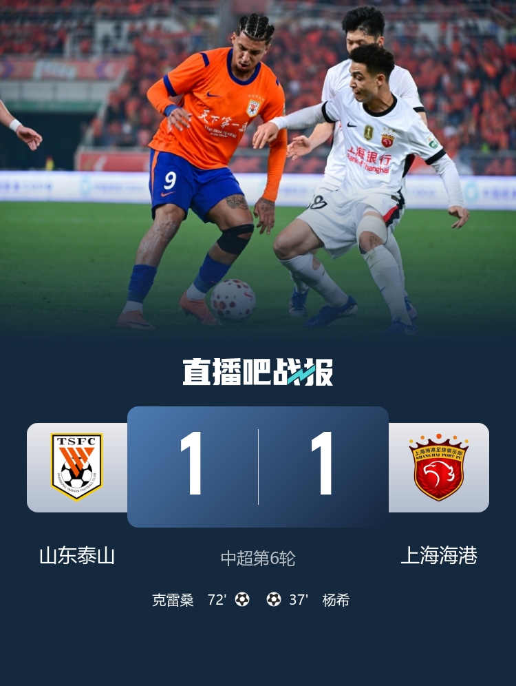 近4轮仅1胜!泰山1-1残阵海港 杨希处子球克雷桑小角度任意球扳平